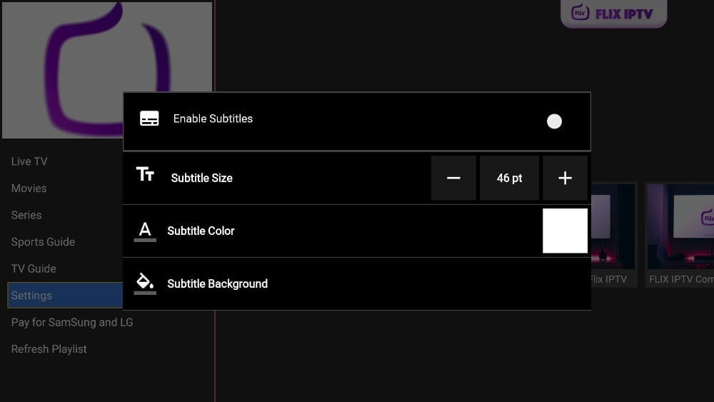 - Personnalisation des sous-titres : très rarement, un lecteur IPTV propose une personnalisation des sous-titres. Flix IPTV est l’un de ces joyaux. Allez dans Paramètres , puis Paramètres des sous-titres pour modifier la taille, la couleur et l’arrière-plan de vos sous-titres.