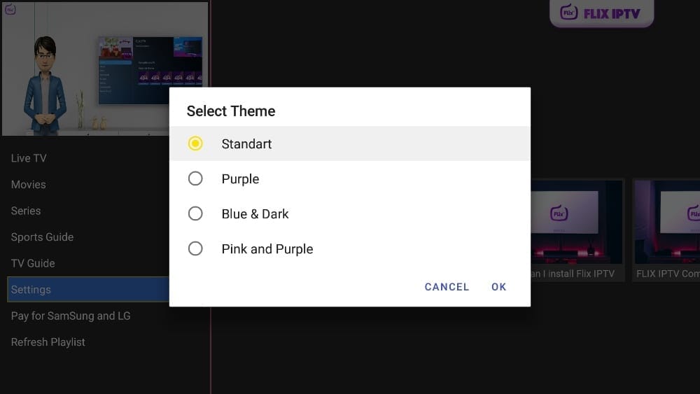 - Moteur de thème : Vous n’êtes pas fan du thème par défaut de Flix IPTV ? Vous pouvez choisir un nouveau thème en allant dans Paramètres , puis sur Modifier le thème .