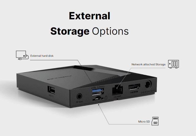 À l’intérieur, nous trouvons 4 Go de RAM DDR4 à 2400 MHz et 32 ​​Go de stockage eMMC. De plus, le streamer multimédia peut être étendu avec un stockage supplémentaire via USB, RJ45 (client de stockage connecté au réseau) et une carte Micro SD.