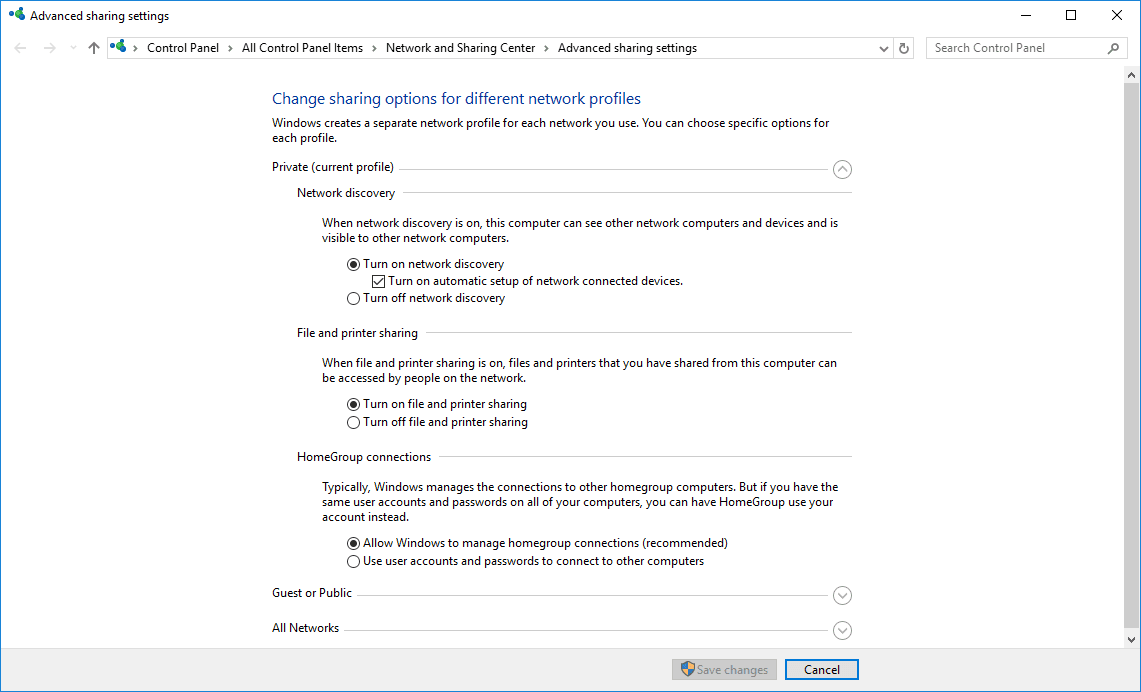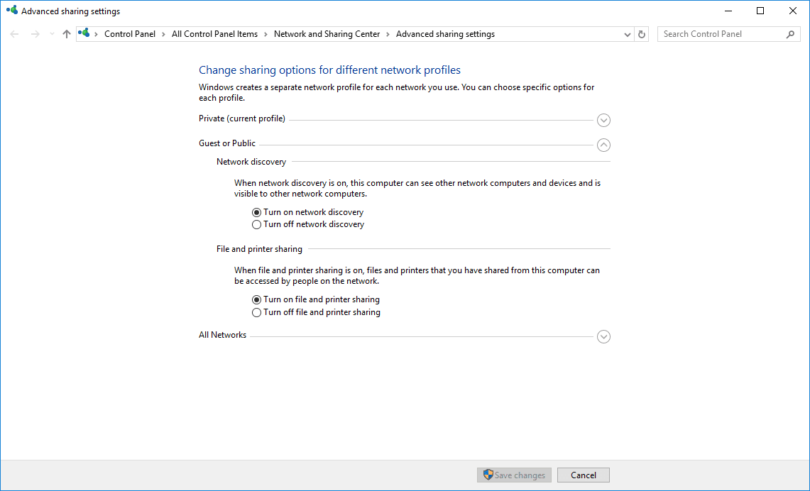 - Définissez les paramètres de partage pour trois profils ( privé , invité ou public et tous les réseaux ):