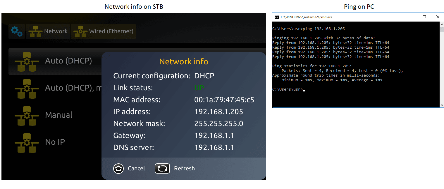Avant de configurer la connexion, assurez-vous que la connexion réseau entre le PC et le STB est accessible – envoyez les demandes d’écho ICMP ( PING) du PC au STB sélectionné.
