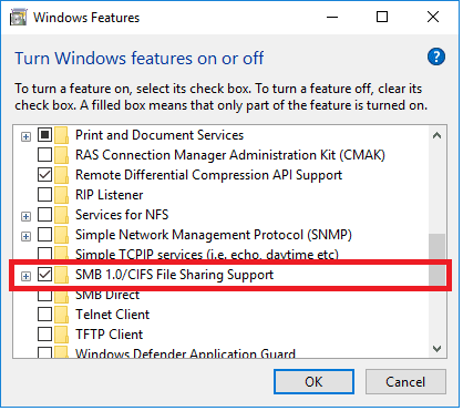 - Assurez-vous que l’ option Prise en charge du partage de fichiers SMB 1.0 / CIFS est activée.