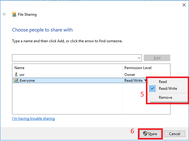 2. Dans la fenêtre ouverte Partage de fichiers, sélectionnez et ajoutez des utilisateurs pour accéder au dossier: