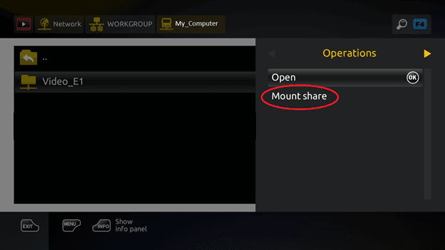 L’établissement d’une connexion à un certain dossier réseau (décrit dans Configuration de la connexion au dossier réseau sur STB et Connexion manuelle au dossier réseau ) conduit au montage de cet ancien sur STB . Si un certain dossier a été monté sur STB, son raccourci se place au niveau supérieur du menu multimédia d’accueil .