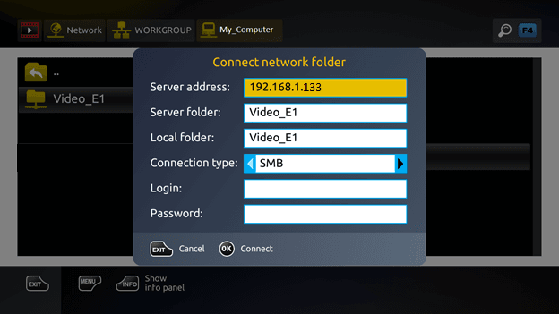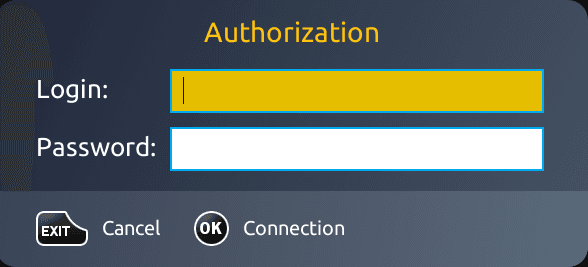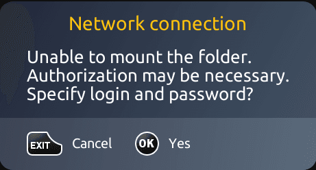 5. Si le dossier est protégé par mot de passe ou que STB ne peut pas monter le dossier pour une raison quelconque, la fenêtre de connexion réseau s’ouvre. Pour obtenir l’accès, vous devez sélectionner OK – la fenêtre d’ autorisation s’ouvre, dans laquelle vous devez entrer les paramètres d’accès au dossier: Login et Mot de passe .