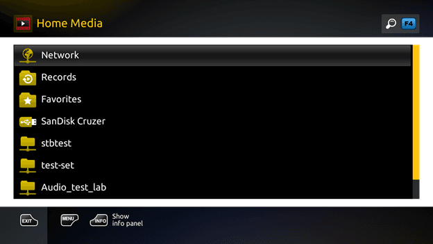 Il est également possible de connecter manuellement STB à un dossier réseau spécifique (s’il n’a pas été découvert automatiquement ). Pour accéder aux ressources réseau et les configurer à l’aide du protocole SMB / Samba sur STB, le menu Média d’accueil est utilisé.