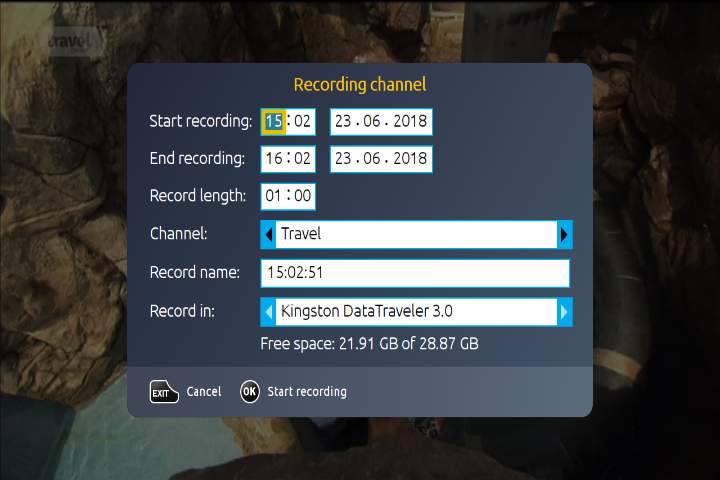 Dans l’ application de chaînes IPTV , il est possible d’enregistrer un fragment de flux audio ou vidéo défini par l’utilisateur pendant la lecture de la chaîne. Les enregistrements sont effectués sur une clé USB connectée à STB. Le format d’enregistrement est le fichier de flux de transport vidéo (.ts), nom du fichier: