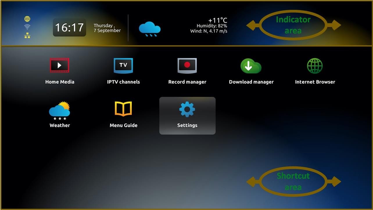 Le menu principal est divisé en la zone d’indicateur (située en haut de l’écran) et la zone de raccourcis (située sous la zone d’indicateur ) .