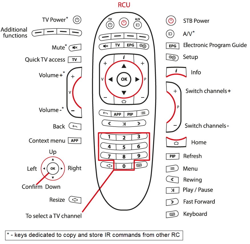 Remarque. La diode émettrice (IR) du RC d’origine ( TV RC ) doit faire face à la fenêtre IR du STB RC. Les diodes émettrices des deux RC ne doivent pas être recouvertes d’autocollants, de boîtiers, etc. - Sur le STB RC, appuyez sur la touche qui stockera les données copiées, la LED sous la touche d’ alimentation STB clignotera une fois pour indiquer la sélection réussie de la touche autorisée (voir Touches dédiées à programmer ). Les deux LED visuelles restent allumées.