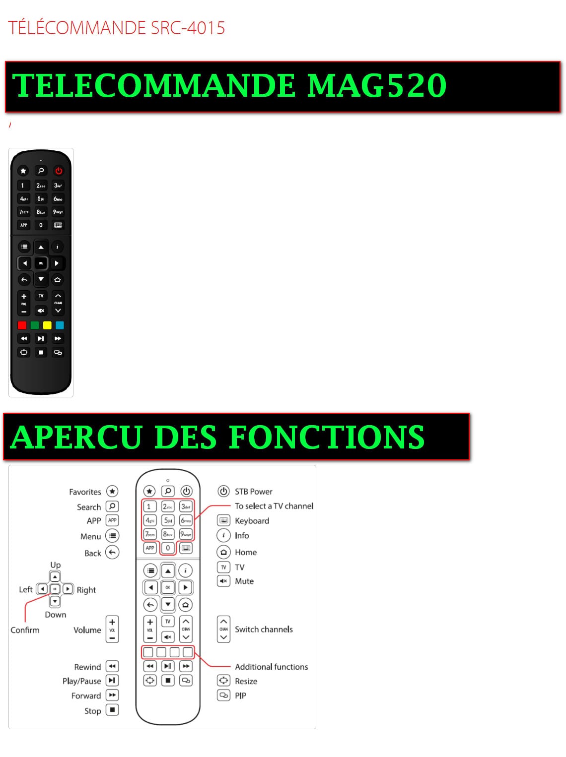 La télécommande MAG520 a plusieurs boutons utiles. Voici les plus importants :
