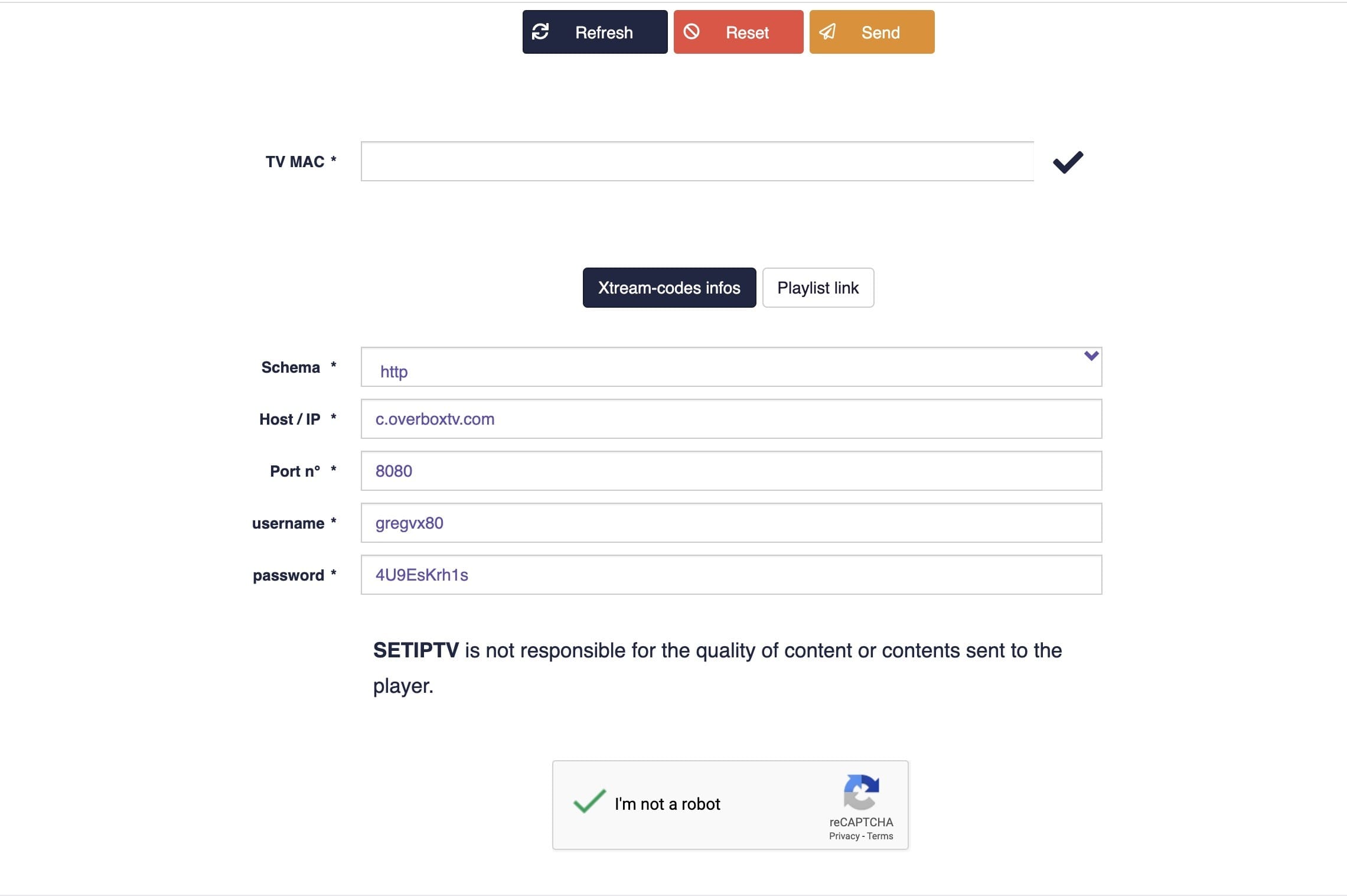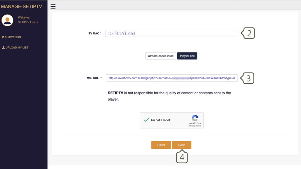 Vous devez activer le captcha (je ne suis pas un robot) et cliquer sur envoyer. Redémarrez votre téléviseur et ouvrez à nouveau SET IPTV, profitez de milliers de chaînes de télévision, de films et de séries.Vide