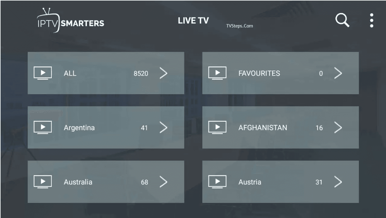 Cliquez sur LIVE TV pour afficher les catégories par pays.