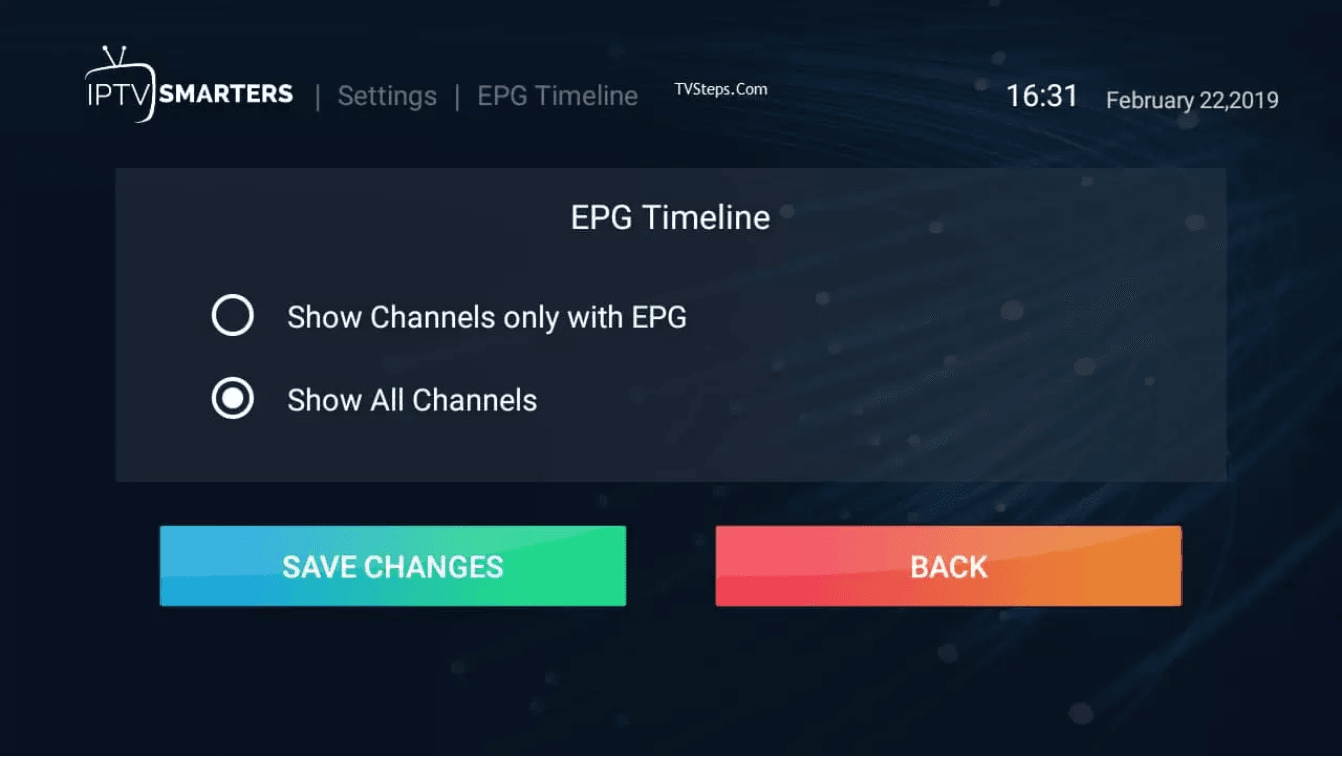 La valeur par défaut sélectionnée est Afficher toutes les chaînes, mais je vous recommande d’aller à Afficher les chaînes uniquement avec EPG. Donc, s’il n’y a pas d’EPG avec un canal, rien ne s’affichera là-haut, sinon, un message par défaut continuera à y être affiché.
