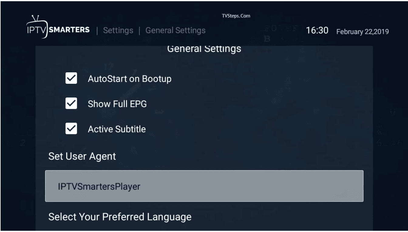 Là, vous pouvez configurer AutoStart au démarrage, afficher l’EPG complet, les sous-titres actifs, définir l’agent utilisateur et changer la langue. Par défaut, les paramètres sont corrects. Si vous voulez changer, vous pouvez le faire ici.