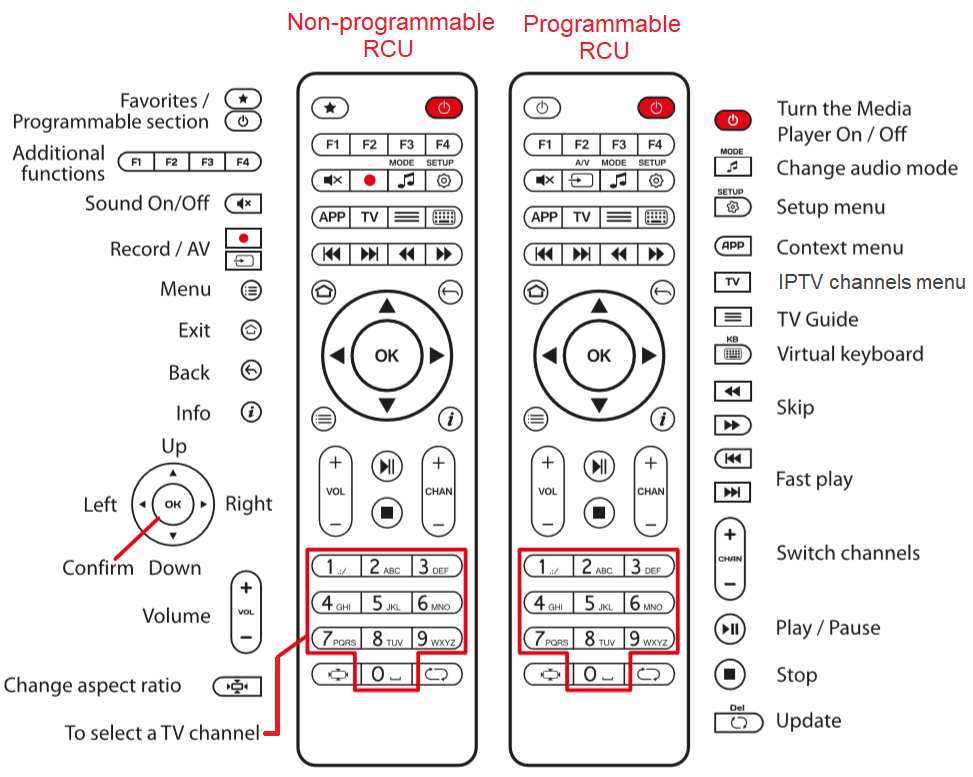 La programmation (ou l’apprentissage) de la télécommande STB signifie assigner à ses boutons certaines fonctions d’un autre appareil (généralement un téléviseur). Le modèle RC doit prendre en charge la programmation. Pour la programmation, seuls les boutons dédiés de la télécommande STB peuvent être utilisés (de couleur bleue).